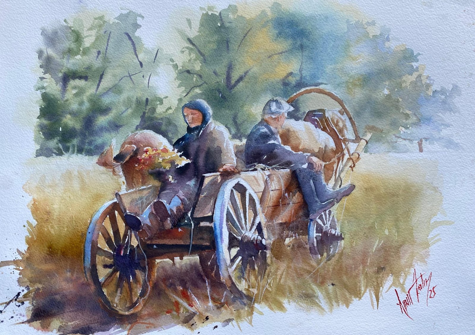 - 📍 Konu: Anadolu temalı tablolar, hasat zamanı, at arabası resmi, kırsal yaşam sanatı, geleneksel Türk köy yaşamı, nostaljik tablolar, figüratif suluboya