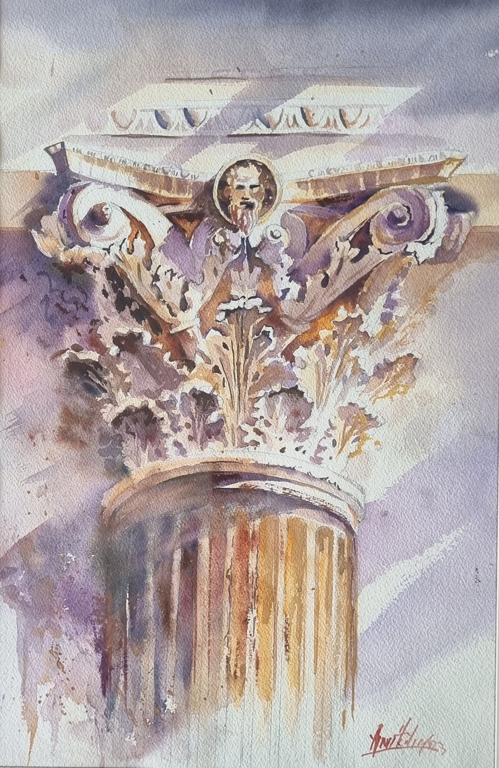 - 📍 Konu: ntik mimari, Sütun başlığı, Arkeoloji, Tarihsel doku, Figüratif suluboya, Mitolojik öğeler, Klasik sanat, Işık ve Gölge, şeffaflık, suyun akışkanlığı, Hediye Tablo, çağdaş sanat, ışık ve gölge çalışması, Aynur Akalın Eserleri.