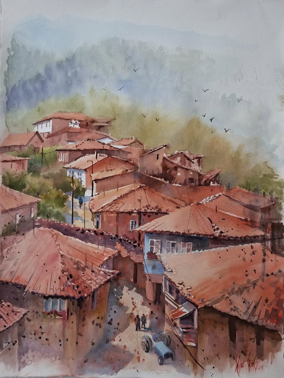 Anadolu sivil mimarisi ve geleneksel köy yaşamı temalı bu özgün Suluboya Tablo, Ressam Aynur Akalın’ın “Anadolu Esintileri” serisinden özel bir çalışmadır.