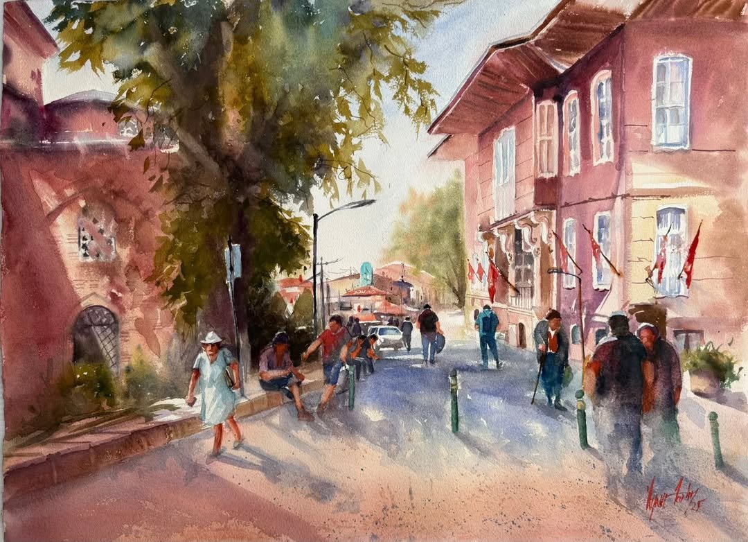 - 📍 Konu: Bursa, Tarihi Mimari, Şehir Yaşamı, Osmanlı Mimarisi, Sokak Manzarası, Figüratif Suluboya, iç mekan dekorasyon sanatı, dramatik atmosfer, klasik estetik, ışık ve yansıma, gökyüzü, gün ışığı, sükunet, Huzur, dinginlik, suyun akışkanlığı, hediye tablo, çağdaş sanat, ışık ve gölge çalışması, Aynur Akalın Eserleri.