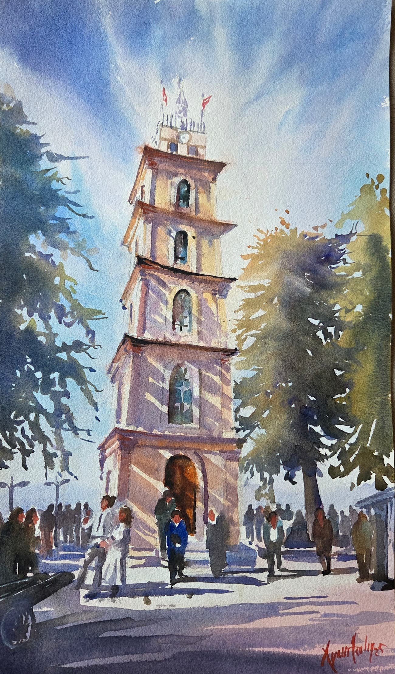 Ressam Aynur Akalın’ın bu özgün eseri, Bursa’nın tarihi Tophane Saat Kulesi’ni ve çevresindeki insan hareketliliğini, suluboya tekniğinin şeffaf ve duygulu dokunuşlarıyla birleştiriyor. Gökyüzündeki dramatik fırça darbeleriyle birleşen tarihi dokunun dinginliğini yansıtan bu koleksiyonluk eser, yaşam alanlarınıza sanatsal bir derinlik katmak için tasarlanmıştır.