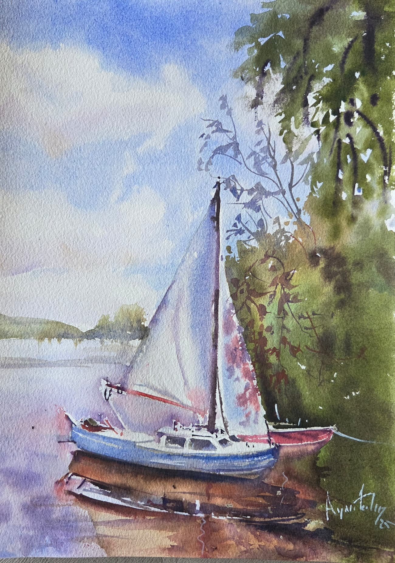 Ressam Aynur Akalın’ın bu özgün eseri, kıyıya yanaşmış bir yelkenlinin su üzerindeki yansımalarını ve doğanın yeşil dokusuyla birleşen sahil atmosferini, suluboya tekniğinin şeffaf ve duygulu dokunuşlarıyla birleştiriyor. Huzur ve sükunet yansıtan bu koleksiyonluk eser, yaşam alanlarınıza sanatsal bir derinlik katmak için tasarlanmıştır.