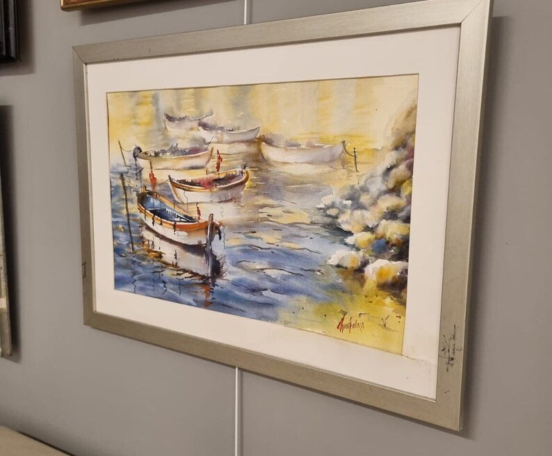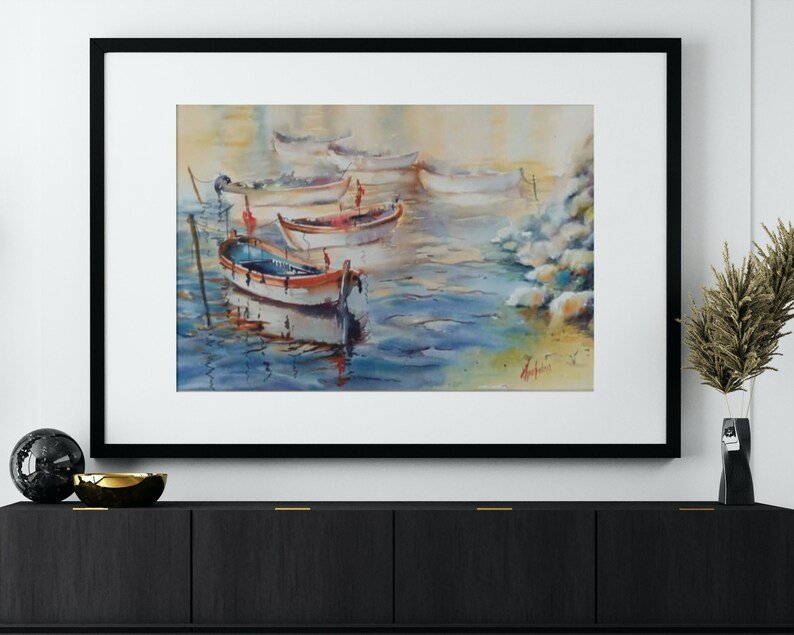 Ressam Aynur Akalın’ın bu özgün eseri, günün ilk ışıklarıyla aydınlanan sakin bir limanda, yan yana dizilmiş balıkçı kayıklarının huzurlu atmosferini, suluboya tekniğinin şeffaf ve duygulu dokunuşlarıyla birleştiriyor. Işığın su üzerindeki yansımasını ve dinginliği yansıtan bu koleksiyonluk eser, yaşam alanlarınıza sanatsal bir derinlik ve deniz kokusu katmak için tasarlanmıştır.