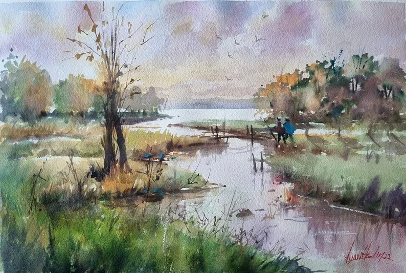 - 📍 Konu: Doğa manzaralı suluboya tabloları, göl kenarı yaşamı, figüratif manzara sanatı, sonbahar peyzajları, suluboyada yansıma teknikleri, dinginlik temalı sanat eserleri, kırsal sahil yaşamı, çağdaş Türk suluboya sanatı.