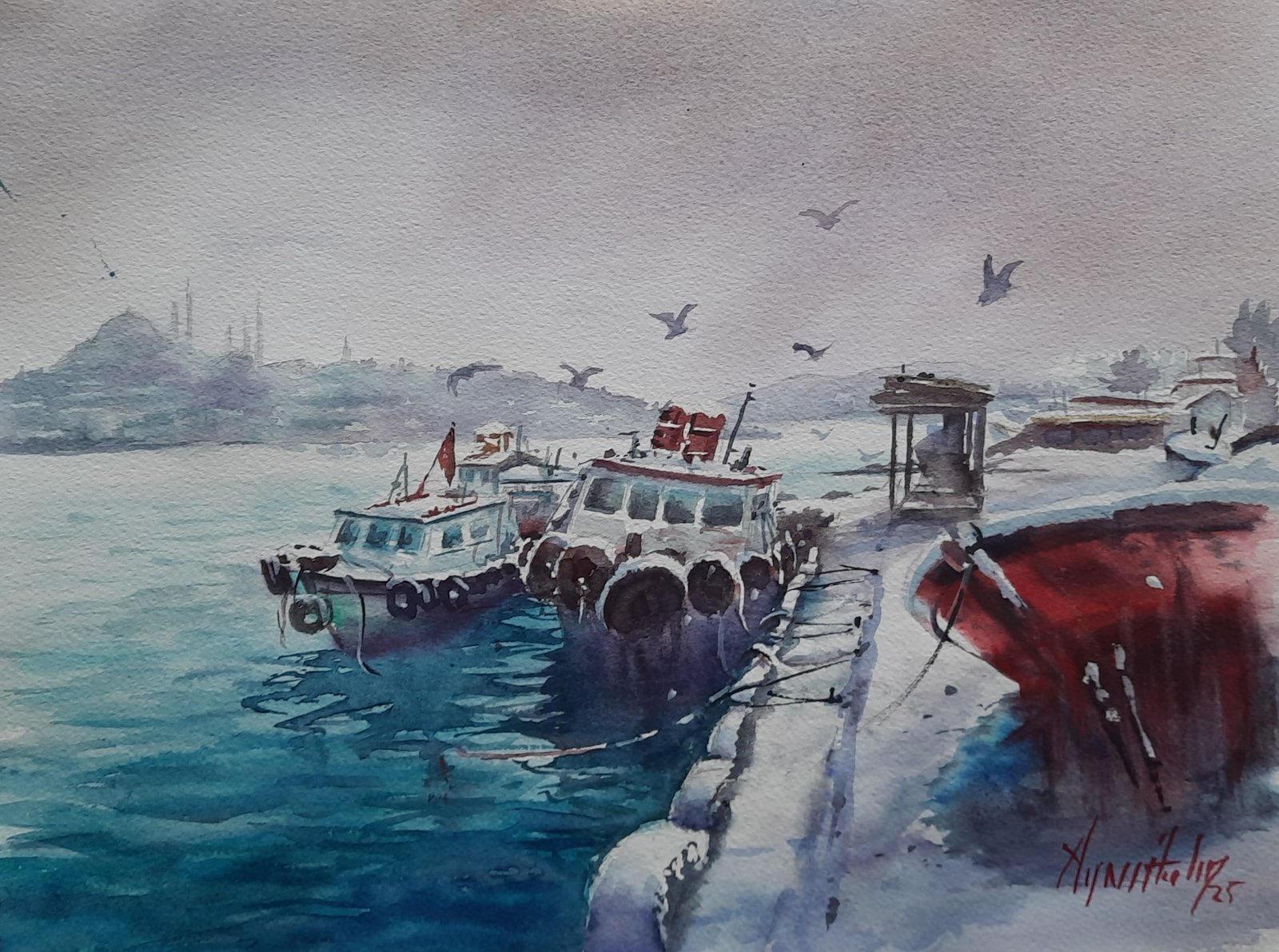 Ressam Aynur Akalın’ın bu özgün eseri, İstanbul’un puslu bir sabahında limana demirlemiş teknelerin dingin atmosferini, suluboya tekniğinin şeffaf ve duygulu dokunuşlarıyla birleştiriyor. Arka planda flulaşan cami silüeti ve ön plandaki güçlü fırça darbeleriyle hüzünlü bir dinginlik yansıtan bu koleksiyonluk eser, yaşam alanlarınıza sanatsal bir derinlik katmak için tasarlanmıştır.