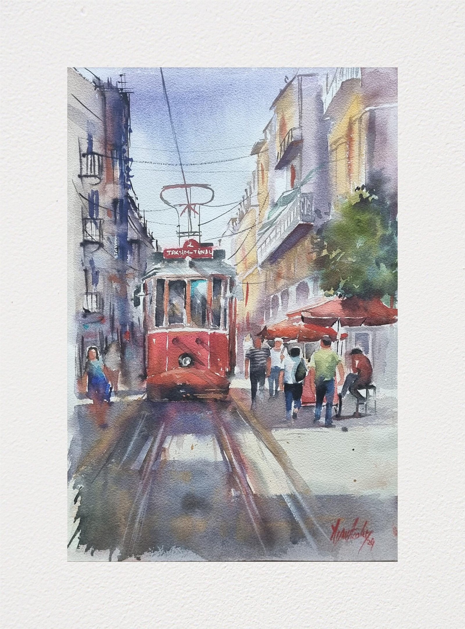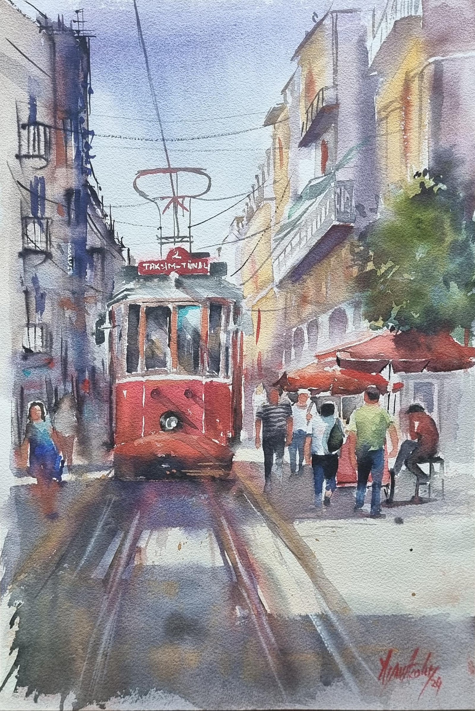 Ressam Aynur Akalın’ın bu özgün eseri, Taksim-Tünel hattının simgeleşmiş kırmızı tramvayını ve Beyoğlu’nun hareketli insan figürlerini, suluboya tekniğinin şeffaf ve duygulu dokunuşlarıyla birleştiriyor. Perspektif derinliği ve gün ışığının mimari üzerindeki dramatik etkisini yansıtan bu koleksiyonluk eser, yaşam alanlarınıza sanatsal bir derinlik katmak için tasarlanmıştır.