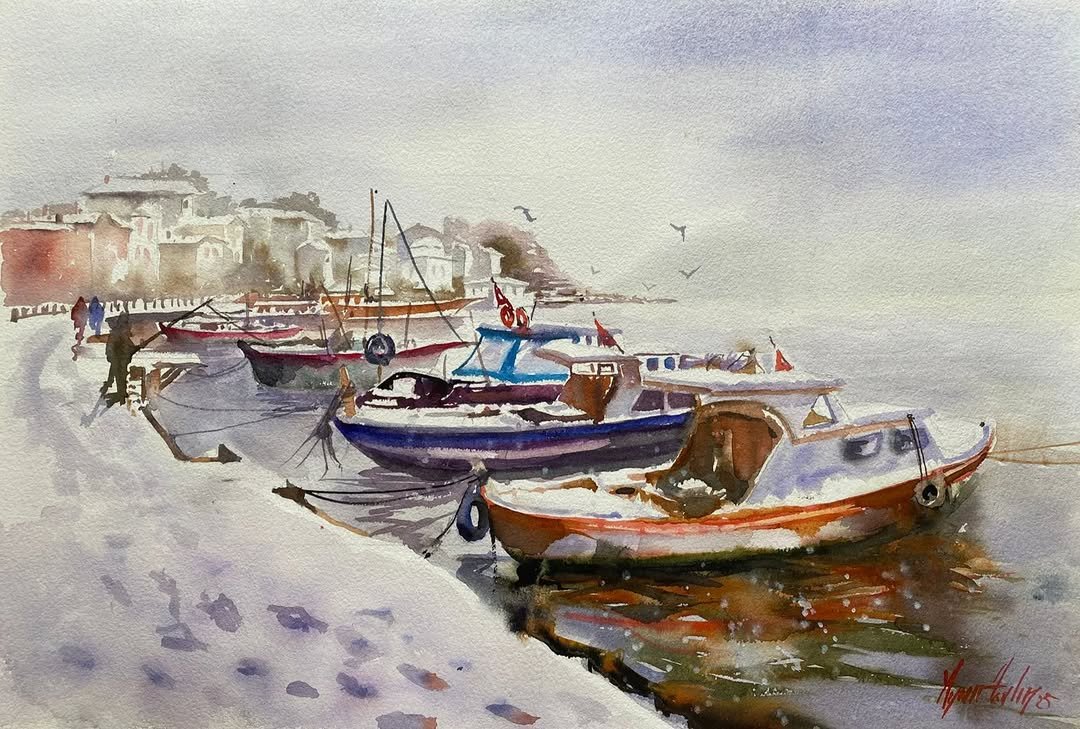 Karlı Sahilde Tekneler Özgün Suluboya Tablo