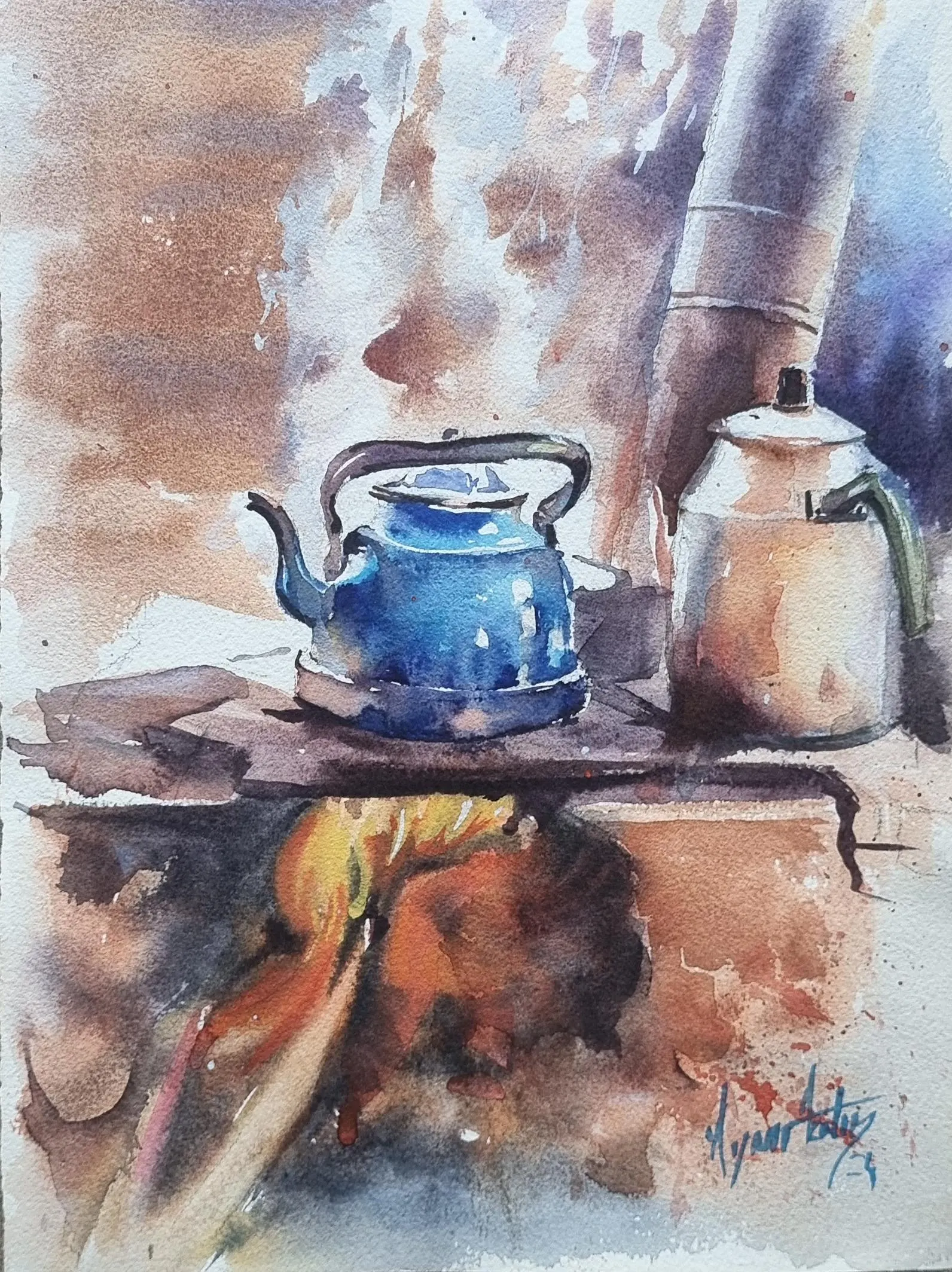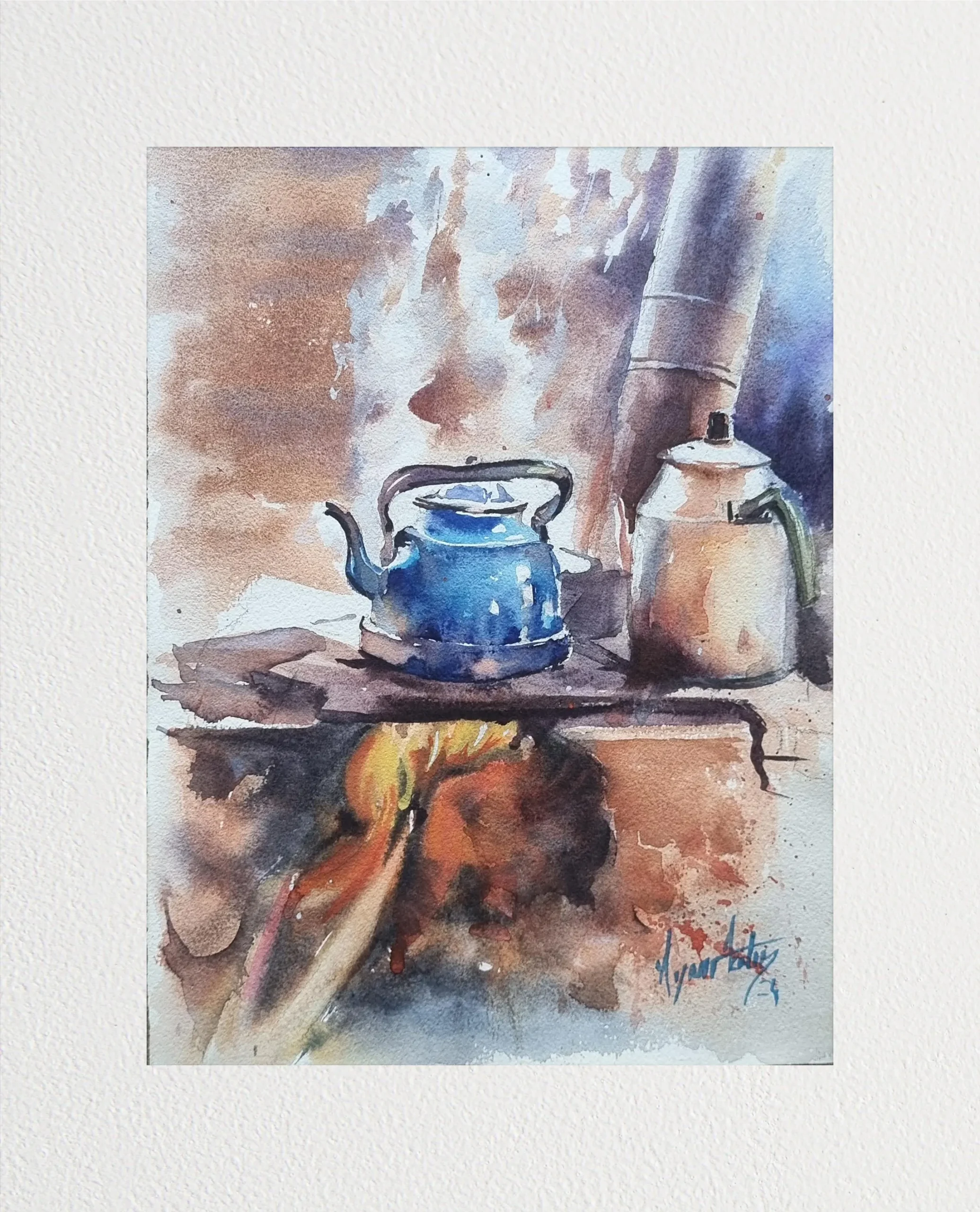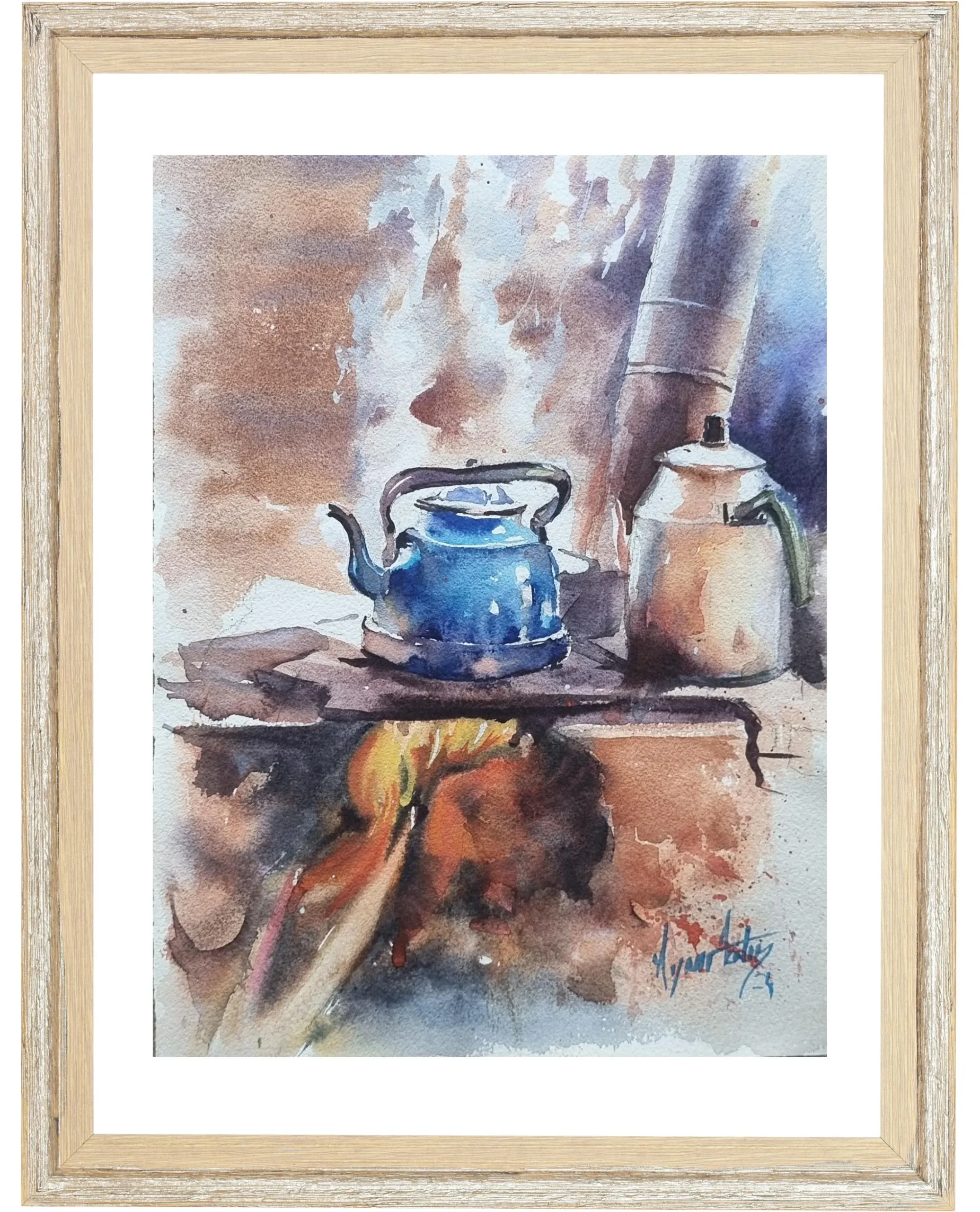 Mavi Çaydanlık ve Kuzine Ateşi – Orijinal Suluboya Tablo