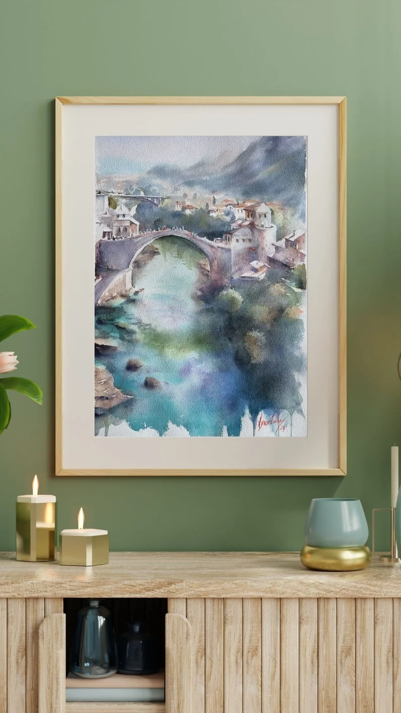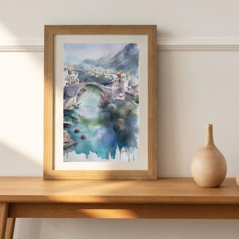 Ressam Aynur Akalın’ın bu özgün eseri, Mostar’ın ikonik kemer yapısını ve nehrin turkuaz yansımalarını, suluboya tekniğinin şeffaf ve duygulu dokunuşlarıyla birleştiriyor. Tarihin ve suyun dinginliğini yansıtan bu koleksiyonluk eser, yaşam alanlarınıza sanatsal bir derinlik ve Balkanlar’ın nostaljik esintisini katmak için tasarlanmıştır.