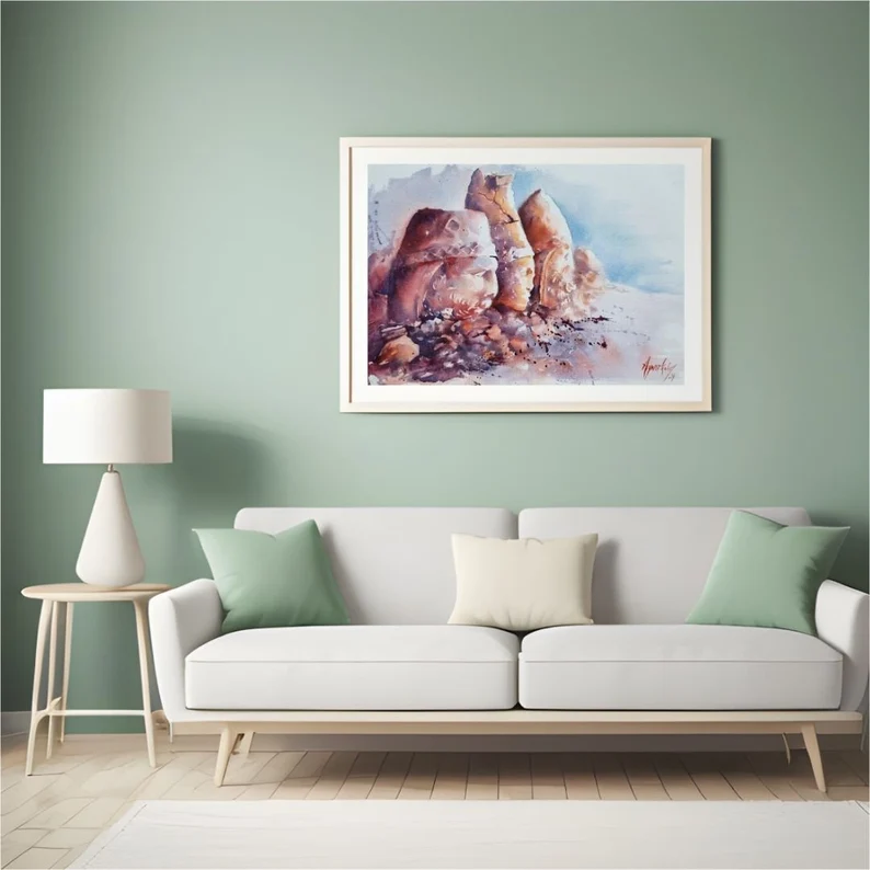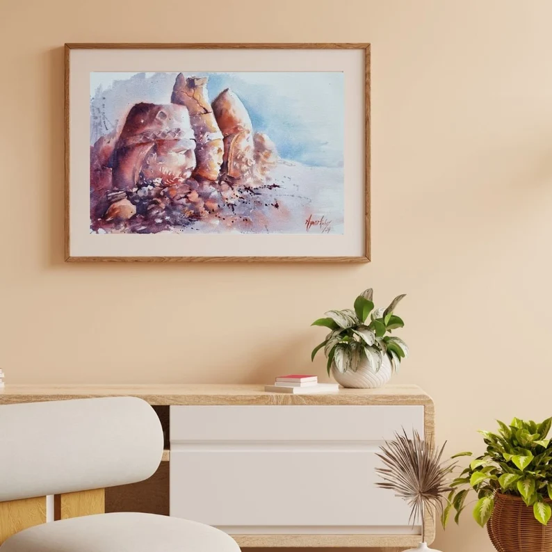 Ressam Aynur Akalın’ın bu özgün eseri, Kommagene Krallığı’nın devasa taş başlarındaki mistik ve mağrur atmosferi, suluboya tekniğinin şeffaf ve duygulu dokunuşlarıyla birleştiriyor. Tarihin derinliğini ve taşın zamana direnişini yansıtan bu koleksiyonluk eser, yaşam alanlarınıza sanatsal bir derinlik katmak için tasarlanmıştır.