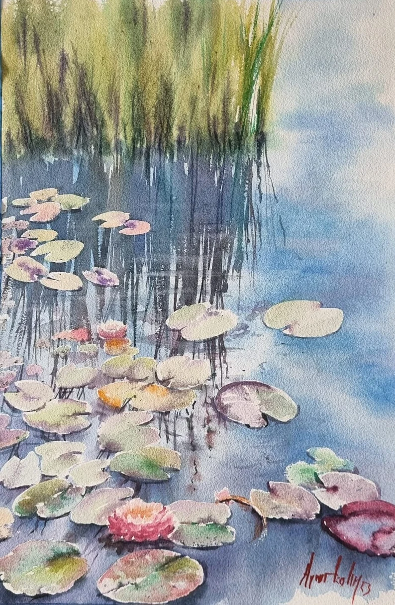 - 📍 Konu: Nilüfer çiçekleri, su yansımaları, sazlıklar, gölet manzarası, doğada dinginlik, suluboya tekniği, şeffaf katmanlar, modern kompozisyon, şeffaflık, suyun akışkanlığı, Hediye Tablo, çağdaş sanat, ışık ve gölge çalışması, Aynur Akalın Eserleri.