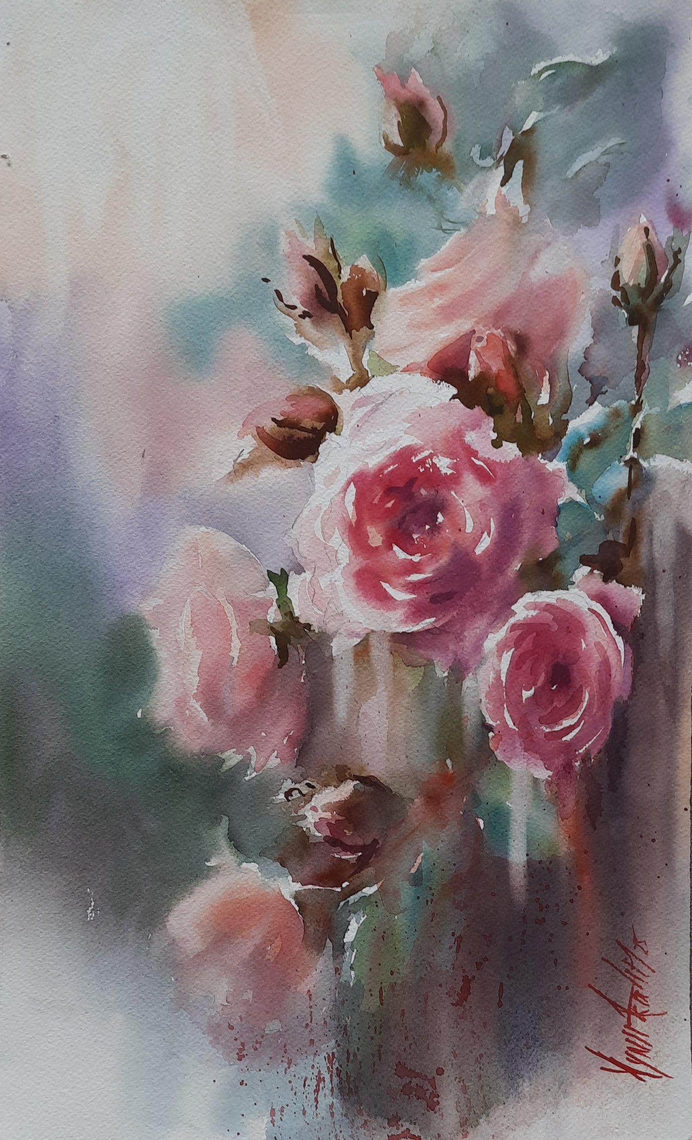 Ressam Aynur Akalın’ın bu özgün eseri, pembe güllerin tomurcuktan açmış forma geçişindeki o kırılgan atmosferini, suluboya tekniğinin şeffaf ve duygulu dokunuşlarıyla birleştiriyor. Arka plandaki soğuk yeşil ve gri tonların, çiçeklerin sıcak pembe pigmentleriyle girdiği kontrast, esere dramatik bir derinlik katıyor. Dinginlik ve romantizm yansıtan bu koleksiyonluk eser, yaşam alanlarınıza sanatsal bir derinlik katmak için tasarlanmıştır.