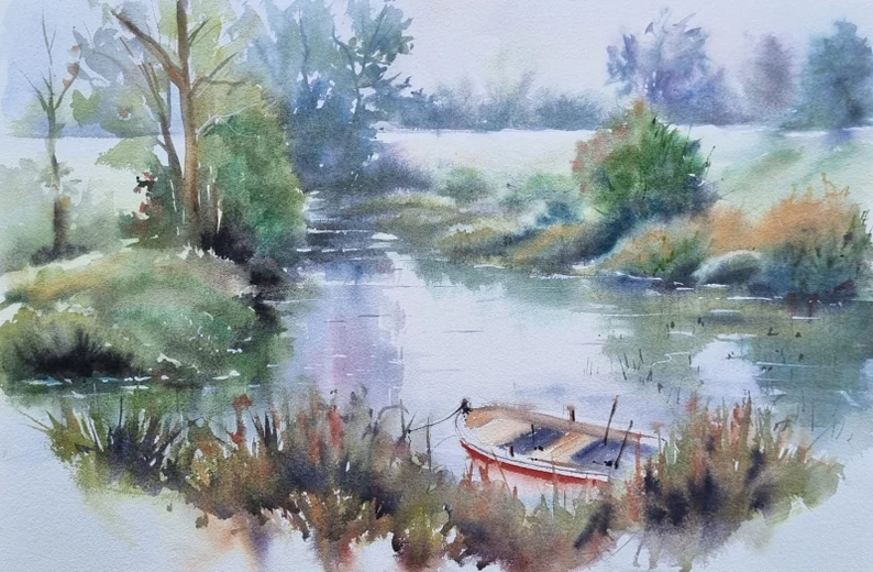 - 📍 Konu: Nehir kenarı manzaraları, suluboya peyzaj sanatı, su yansıması tabloları, sandal ve kayık resimleri, dingin doğa teması, kıyı yaşamı sanatı, atmosferik suluboya, modern peyzaj tabloları.