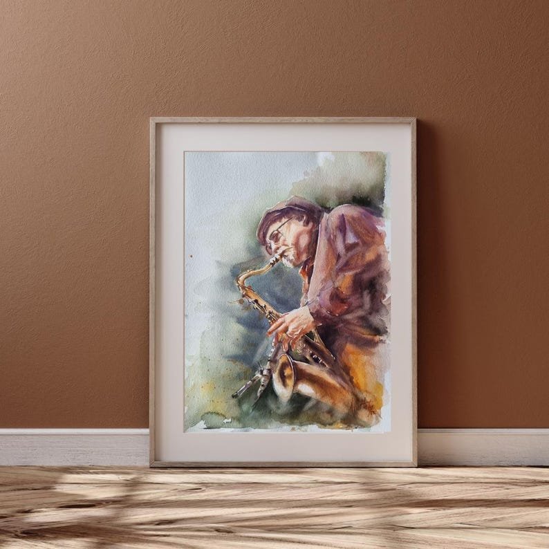 • 📍 Konu: Müzik temalı figüratif tablolar, caz ve blues sanatı, enstrüman çalan sanatçı resimleri, modern suluboya portreler, performans sanatı betimlemeleri, saksafoncu figürü, duygu odaklı suluboya çalışmaları, iç mekan duvar dekorasyonu için sanatsal eserler.