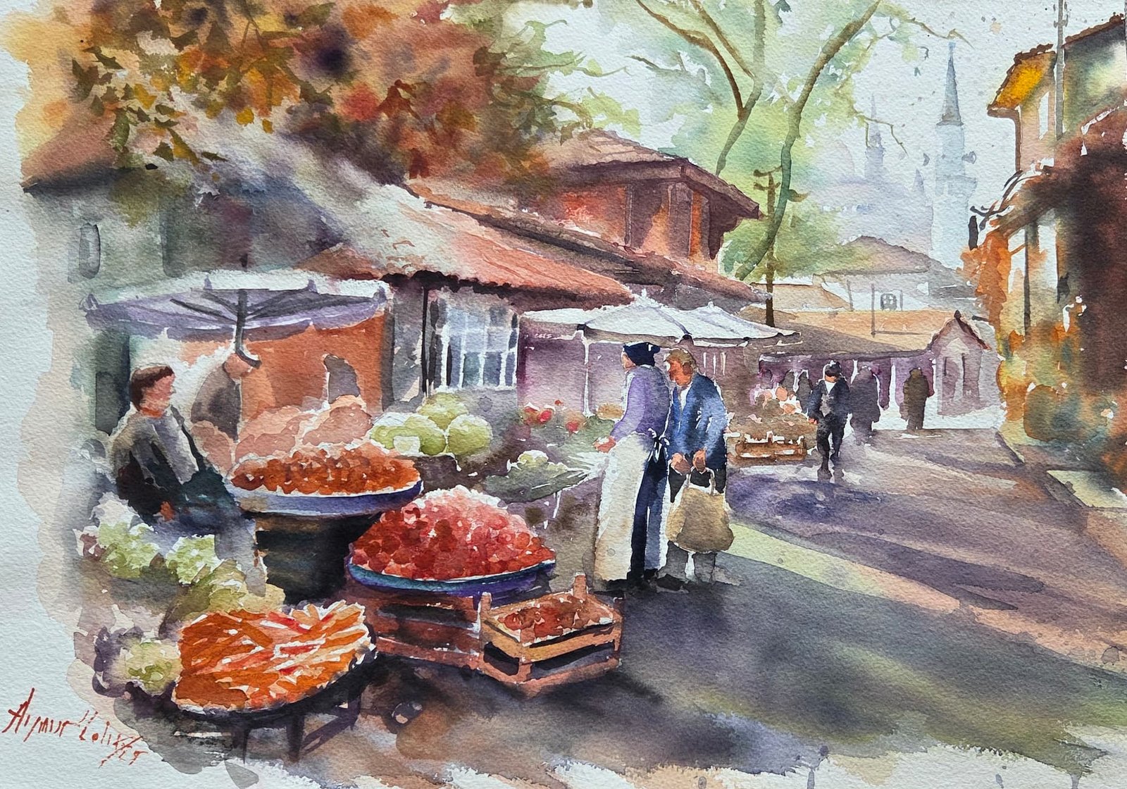 Nostaljik sokak dokusunu ve pazar yerinin canlılığını yansıtan bu özgün Suluboya Tablo, Ressam Aynur Akalın’ın “Şehir Hafızası” serisinden özel bir çalışmadır.