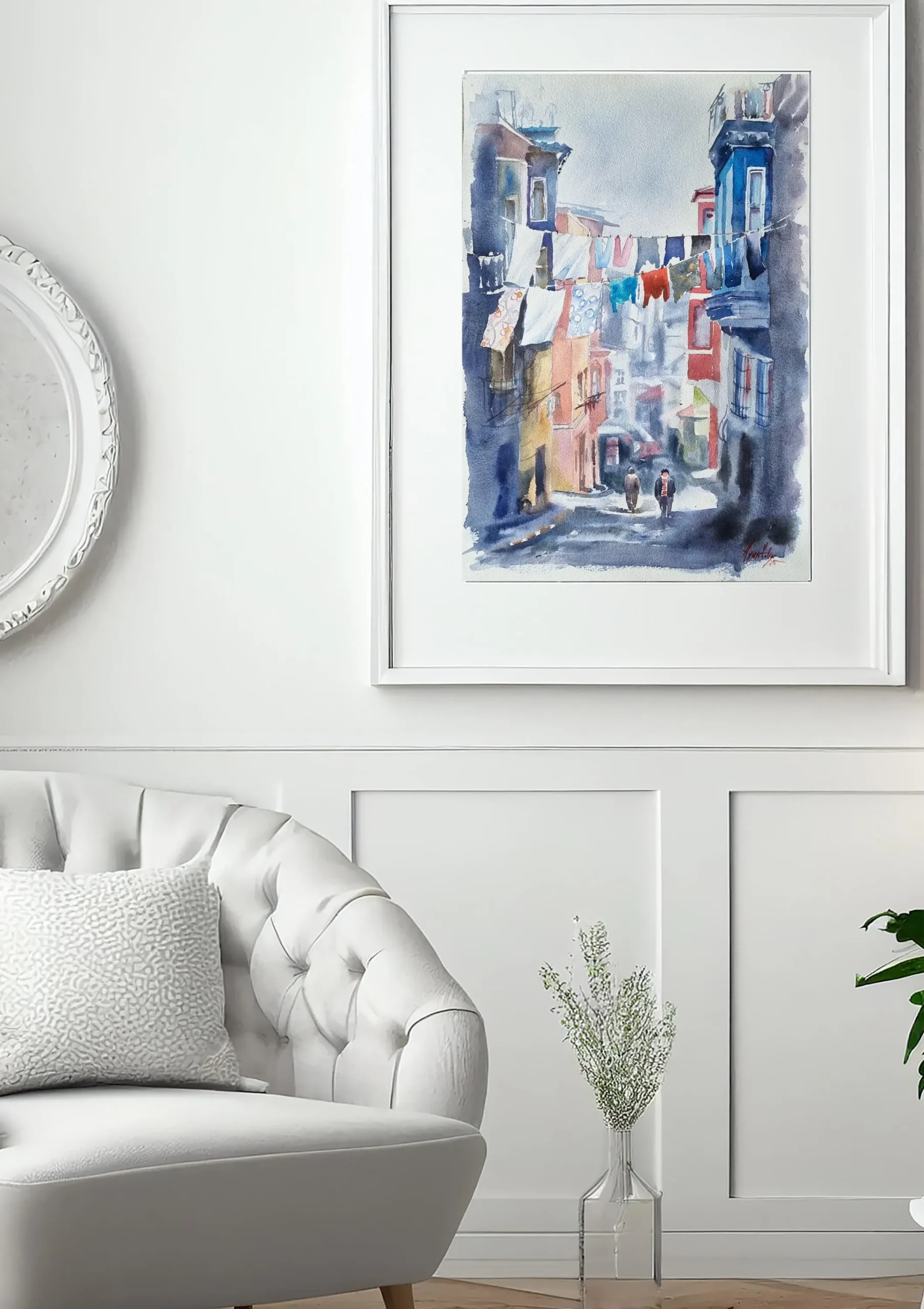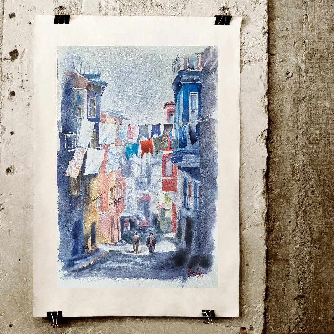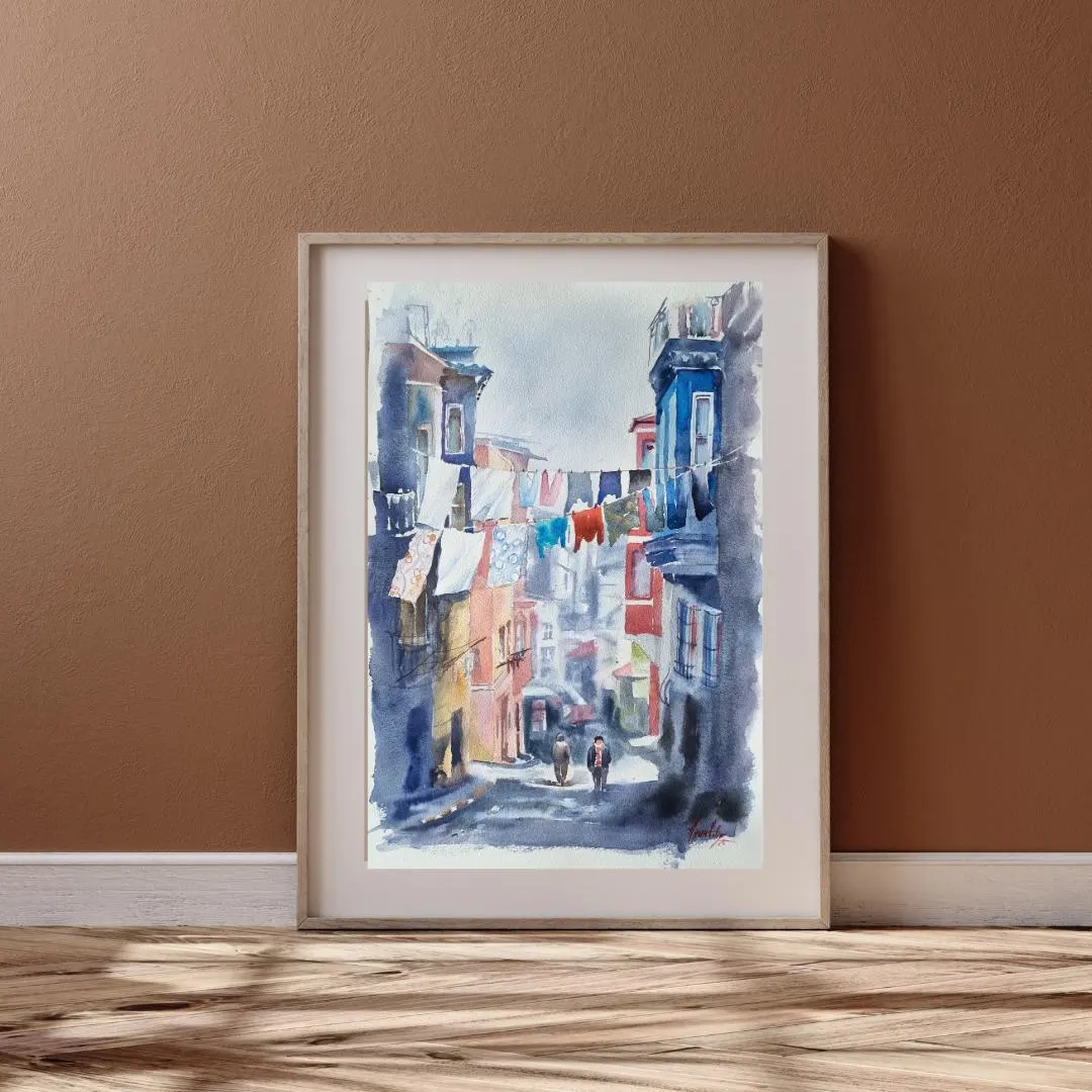 Ressam Aynur Akalın’ın bu özgün eseri, Tarlabaşı’nın karakteristik dar sokaklarını, binalar arasında uzanan çamaşır iplerini ve semtin kendine has çok katmanlı yapısını suluboya tekniğinin şeffaf dokunuşlarıyla ele alıyor. Dramatik ışık kullanımı ve kentsel gerçekliği yansıtan bu koleksiyonluk eser, yaşam alanlarınıza güçlü bir görsel hikaye katmak için tasarlanmıştır.